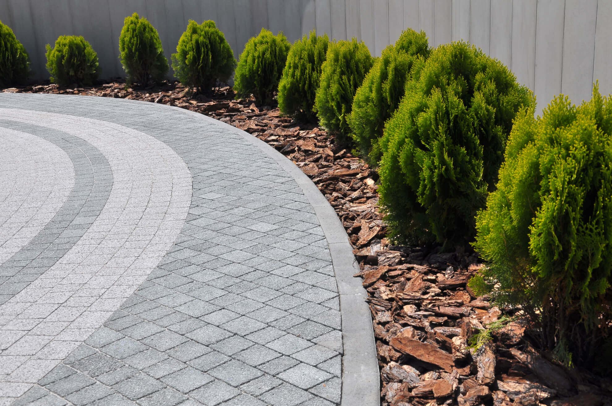 Stödmur i granit med integrerade kantstöd längs uppfarten. Kombinerar funktion och estetik för en praktfull inramning.